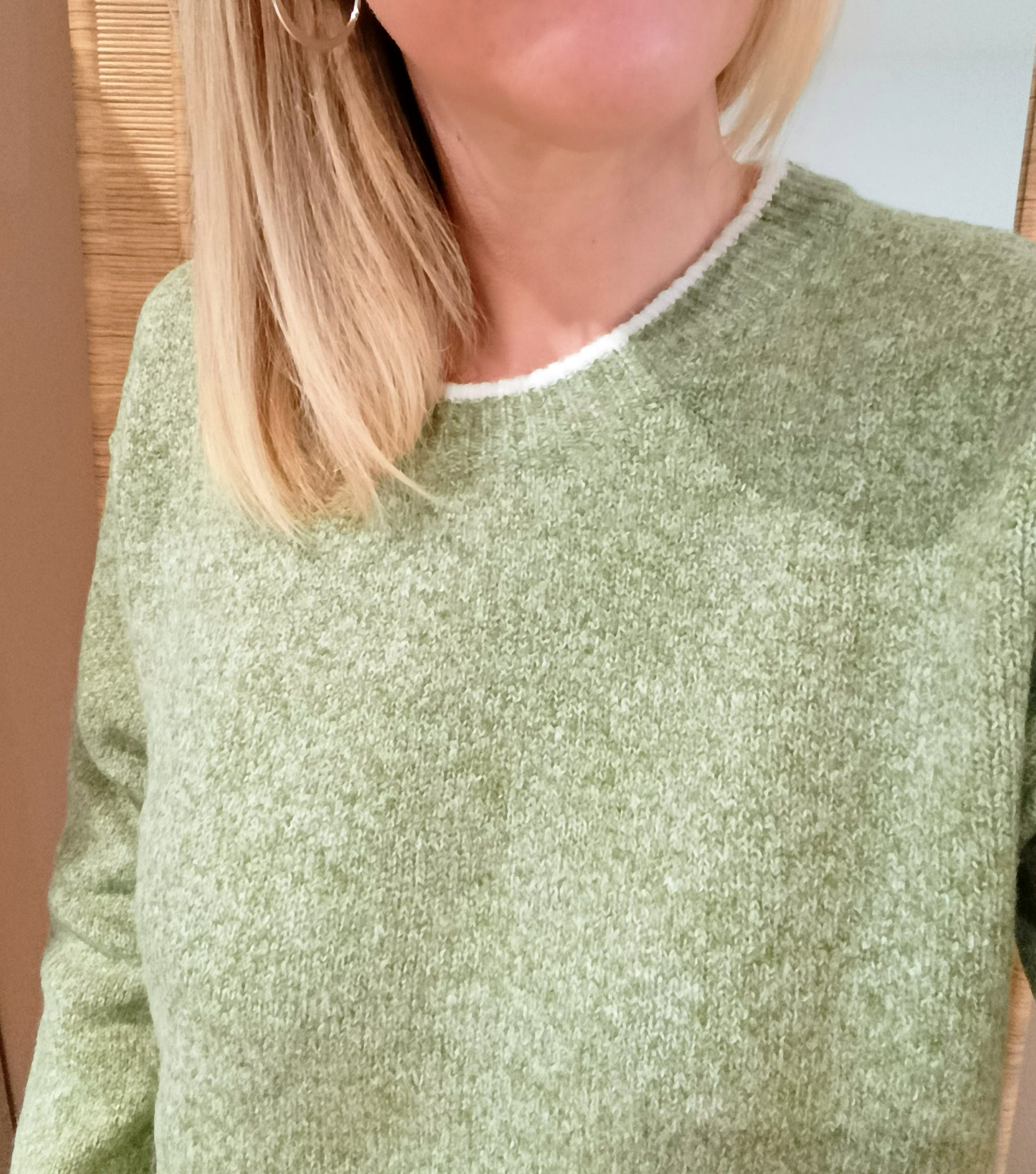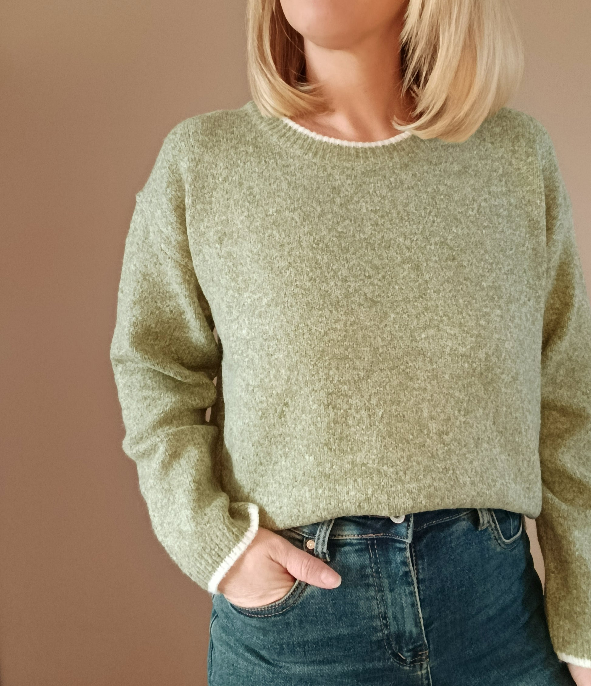 Ce pull est MAGNIFIQUE, par sa couleur vert olive avec un bord blanc et un petit cœur sur le bas.